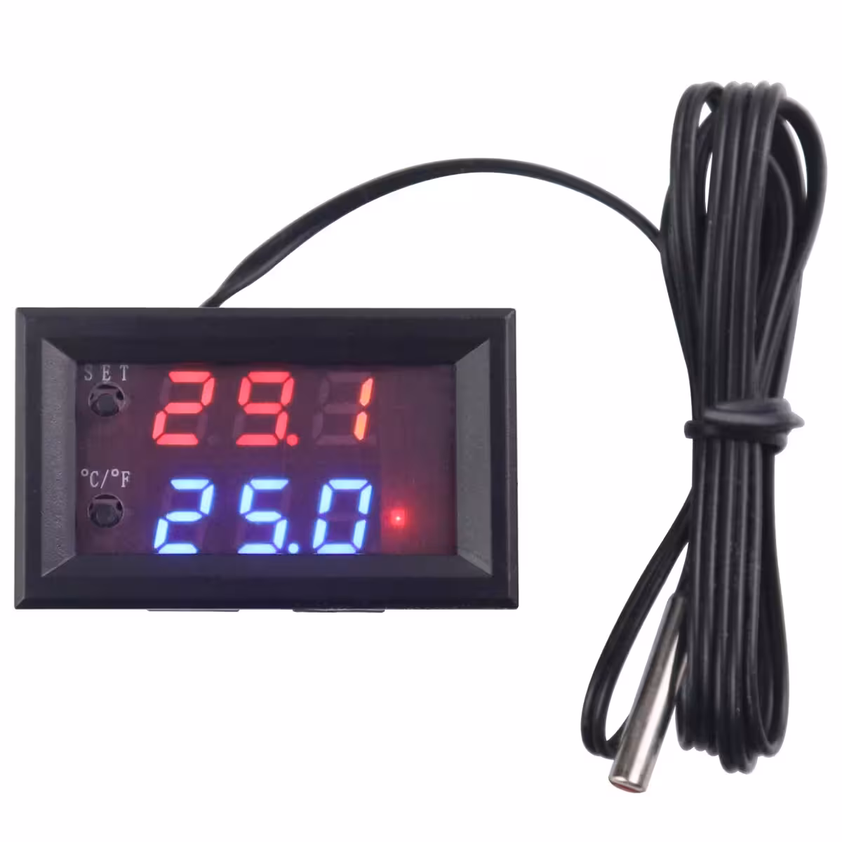 Inkluderer en vandtæt NTC-probe, et strømrelæ og et LED-display, der opdateres hver 0,5 sekund. Alle funktioner kan tilpasses via programmeringsmenuen, der tilgås med SET-knappen.