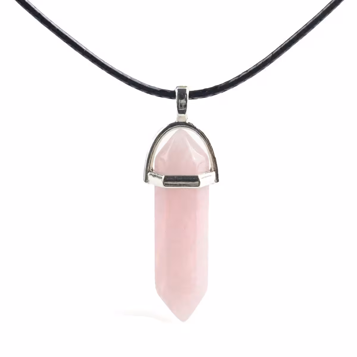 Tilbuddet inkluderer: rosenkvarts-vedhæng og læderkæde, elegant og holdbar, med karabinhage-lukning.
