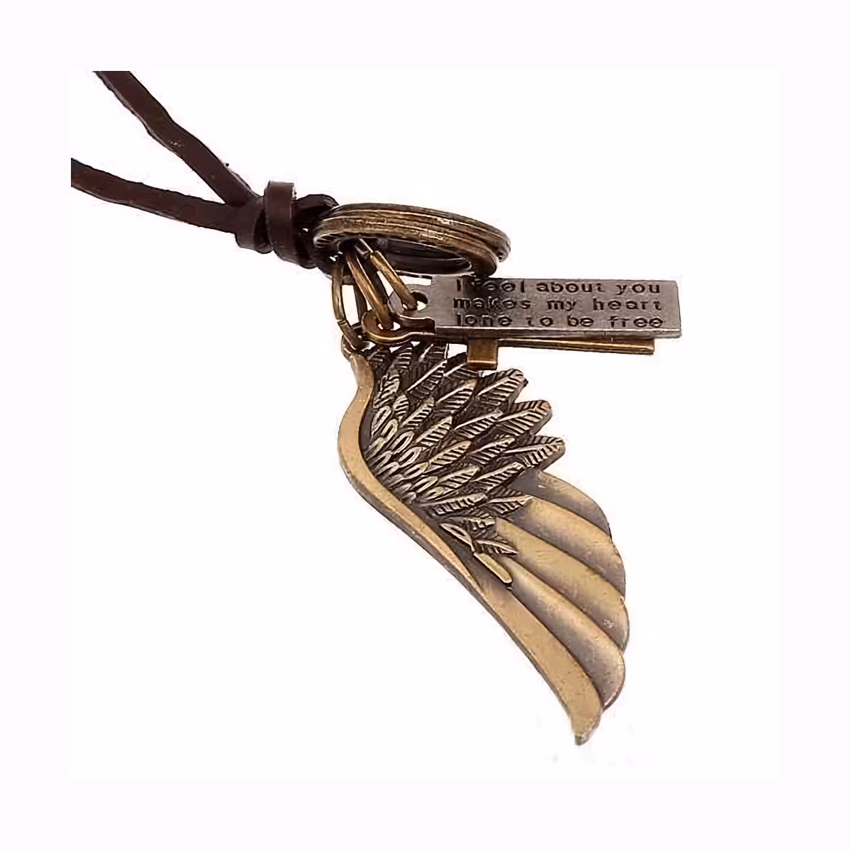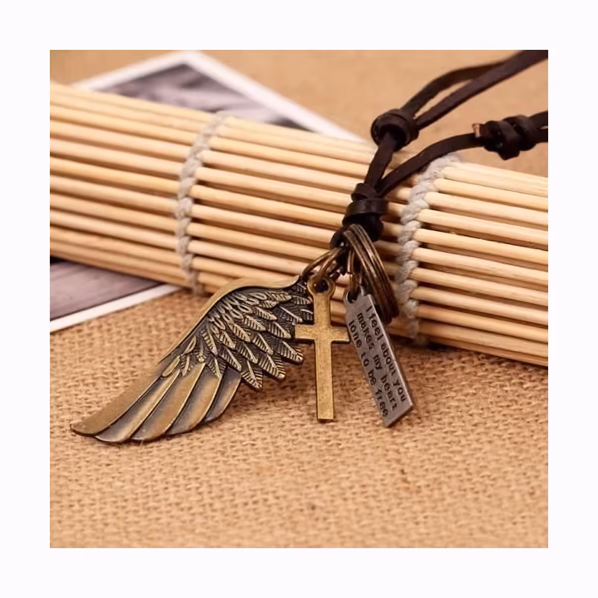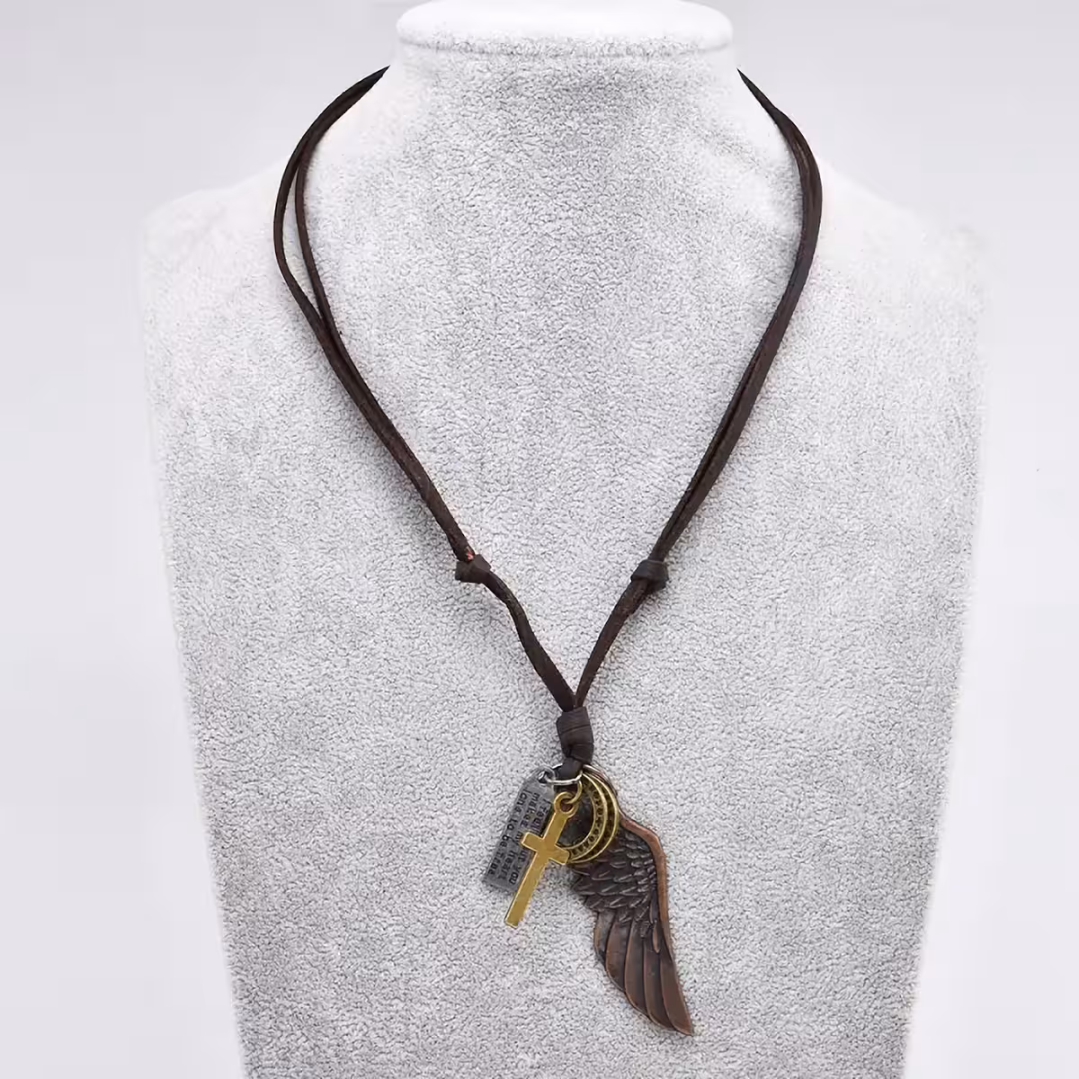 Denne kæde kombinerer højkvalitets naturlæder med et vedhæng af zinklegering, som forestiller en englevinge og et subtilt kors, hvilket giver et distinkt og sofistikeret udtryk.