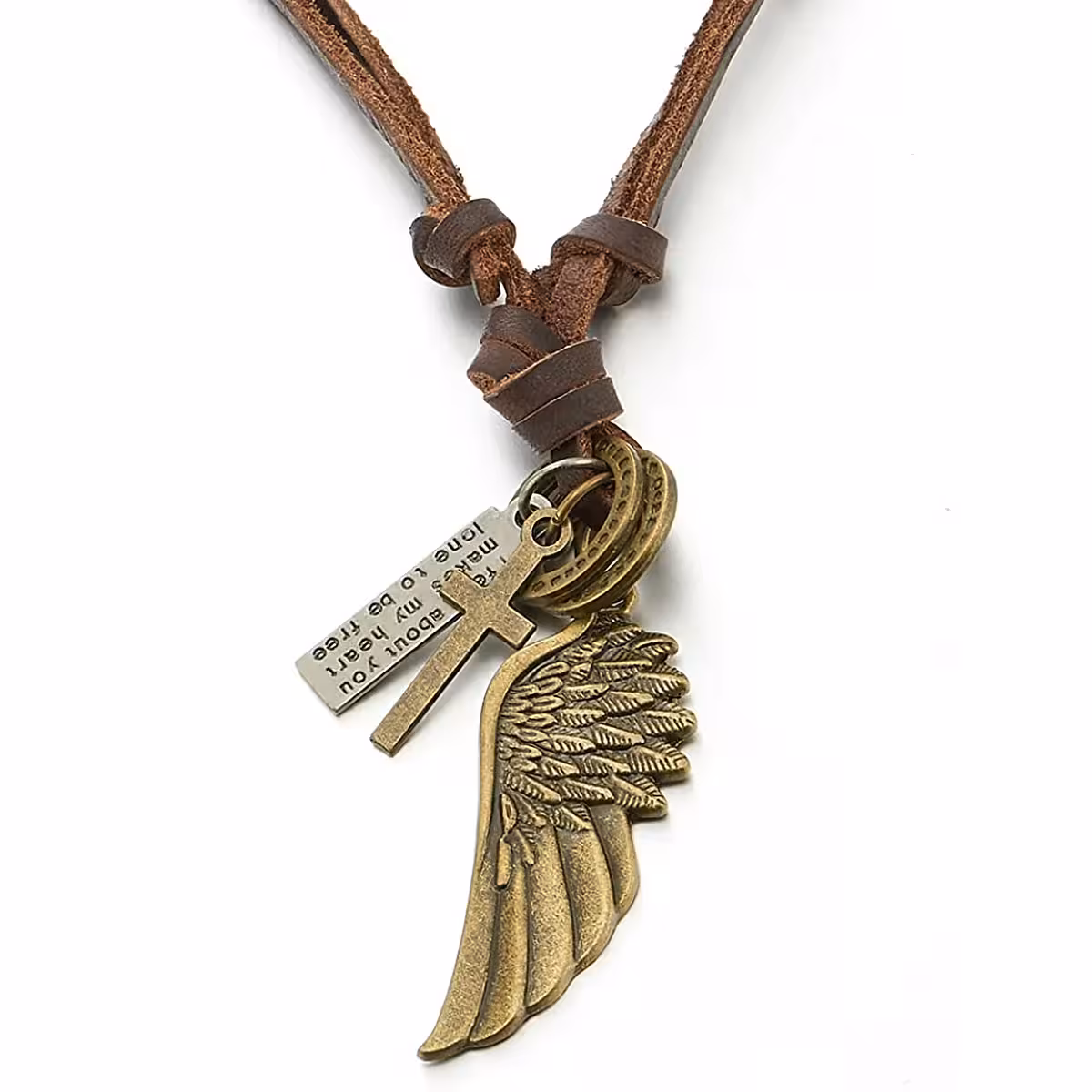 Denne læderkæde med englevinge- og korsvedhæng er et inspirerende valg for mænd, der ønsker et accessory med betydning og autentisk stil.
