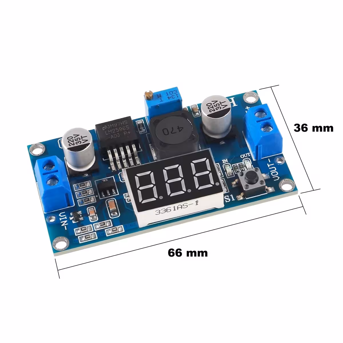 Denne LM2596 spændingskonverter er et step-down modul (buck converter), der reducerer spændingen fra 4–40V DC til en justerbar værdi mellem 1,25V og 37V.