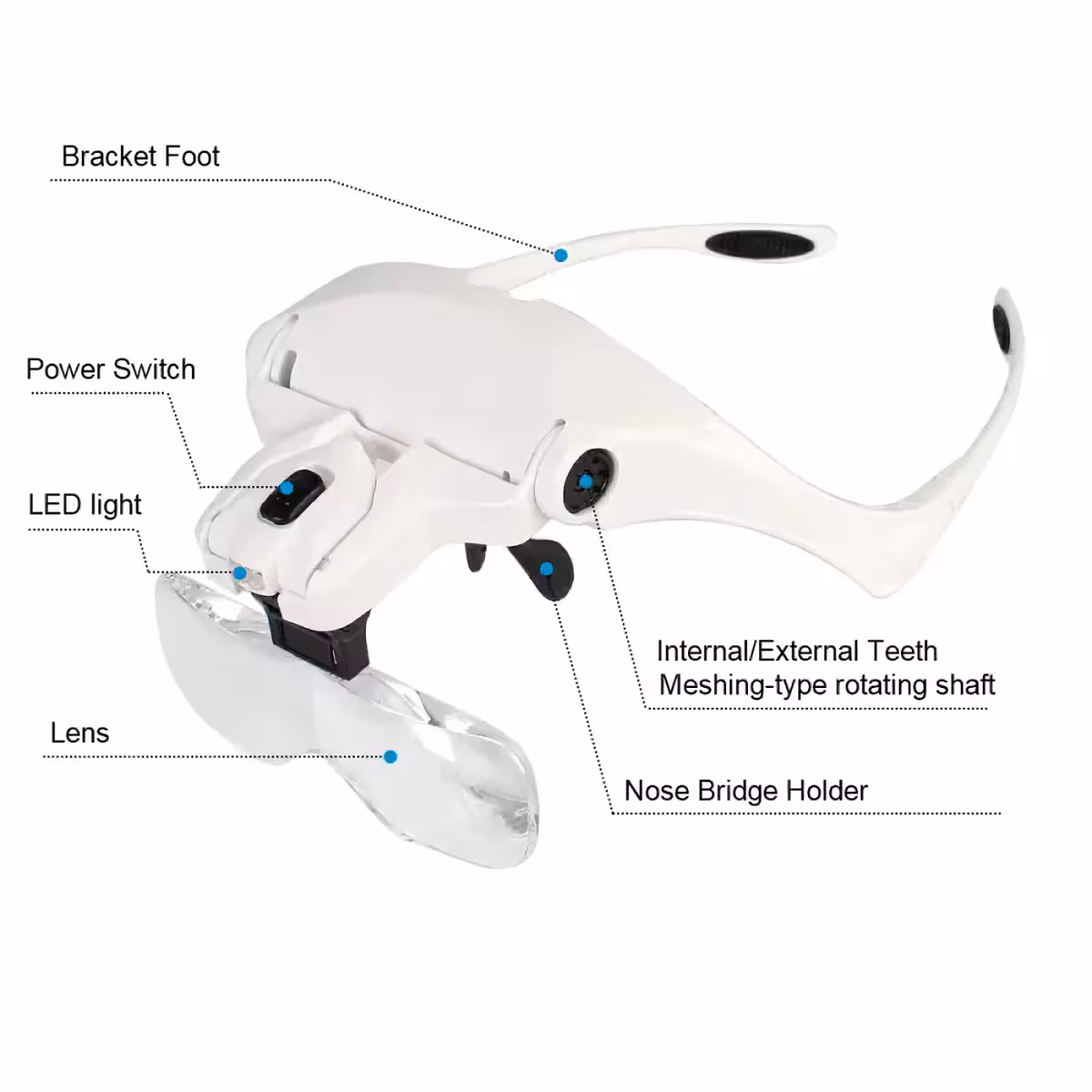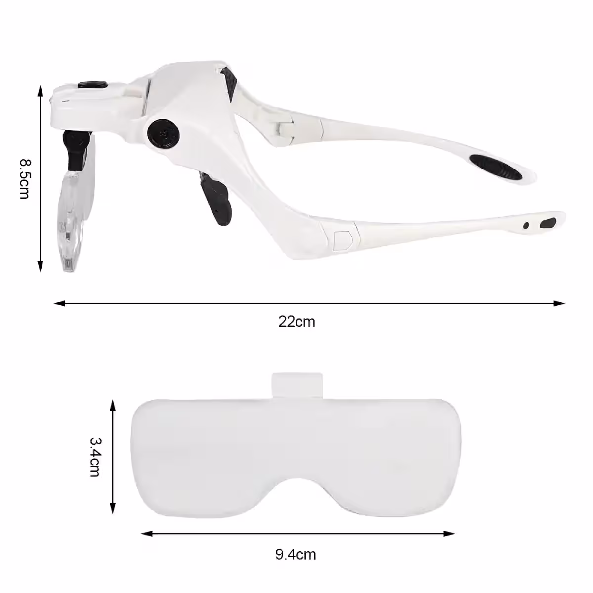 Disse forstørrelsesbriller er ideelle til urmager, elektronikere, guldsmede, tandlæger eller hobbyentusiaster, der arbejder med detaljerede opgaver. Brillerne leveres med fem udskiftelige linser (1.0X, 1.5X, 2.0X, 2.5X, 3.5X) og justerbar LED-belysning for klar synlighed under alle forhold.