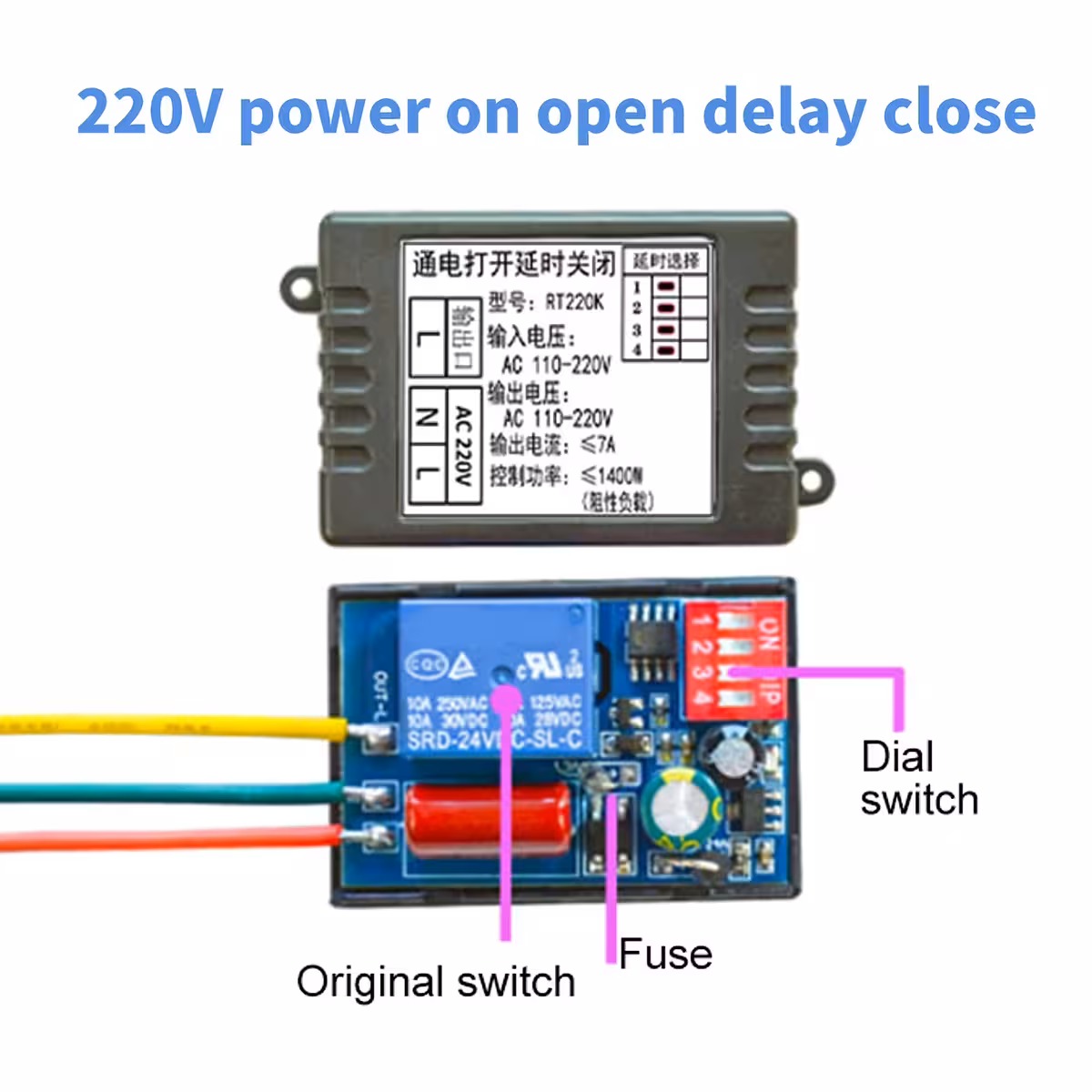 Dette mekaniske/analoge tidsrelæ modul muliggør tidsstyring ved tænding og forsinkelse ved slukning (OFF-delay) med justerbart interval på 1–480 minutter. Ideelt til husholdnings- og industrielle applikationer, kompatibelt med AC 220V og maksimal strøm på 7A. Modulet er kompakt, energieffektivt og nemt at installere.