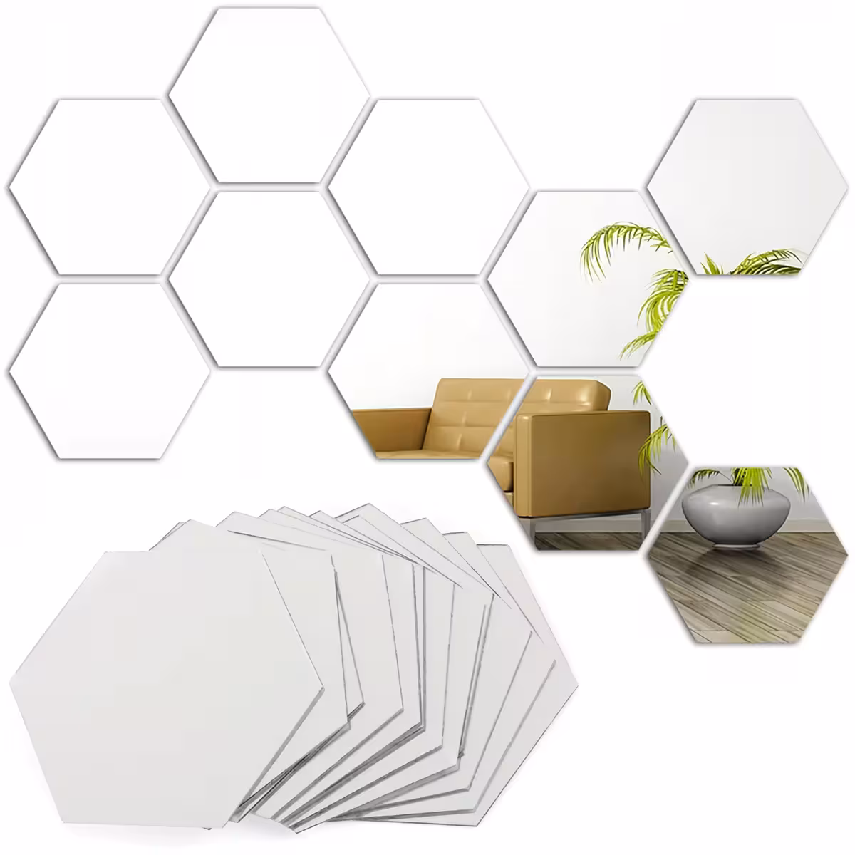 Den hexagonale form gør det muligt at kombinere hvert spejl præcist for at skabe et ensartet og tilpasset dekorativt mosaik. Ideelt til stue, soveværelse, gang, badeværelse eller endda kontor.