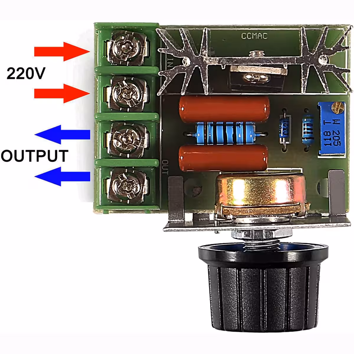 Tilslutning er enkel: de to indgangsledninger forbindes til elnettet (fase og nul), og de to udgangsledninger tilsluttes den elektriske enhed, der skal kontrolleres (motor, ventilator, lampe osv.). Sørg for, at det tilsluttede udstyr ikke overskrider den maksimale effekt på 2000W. Ved høj belastning anbefales det at montere en ekstra ventilator til køling af radiatoren.