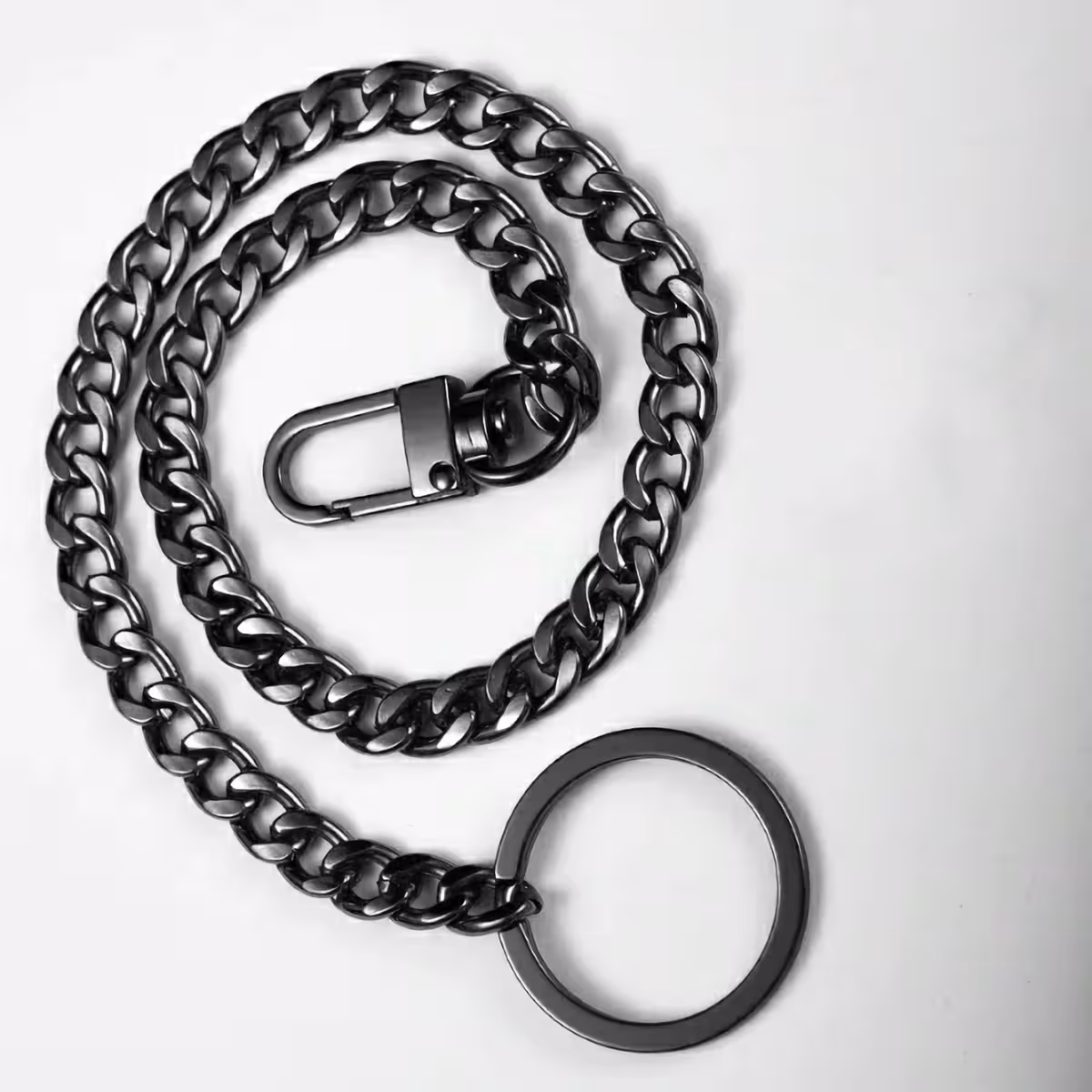 Fremstillet af holdbart rustfrit stål, har kæden en sort kromfinish, solid konstruktion og er udstyret med Snap-On lukning i den ene ende og nøglering i den anden. Den kan nemt fastgøres til jeans, militærbukser, straight-fit eller lavtaljede bukser.
