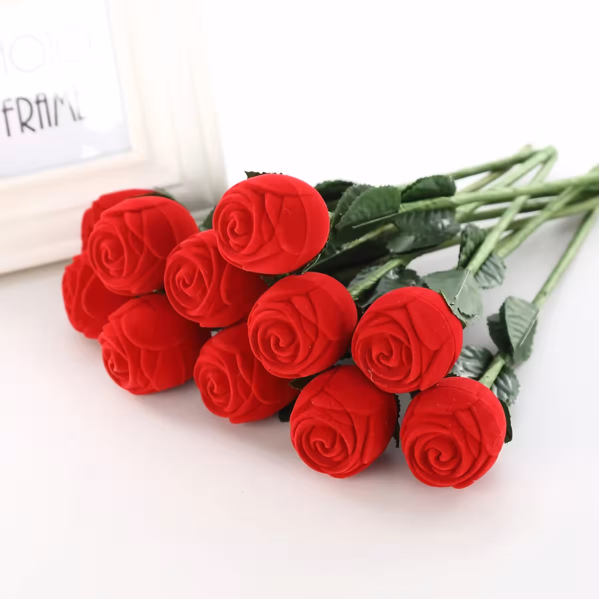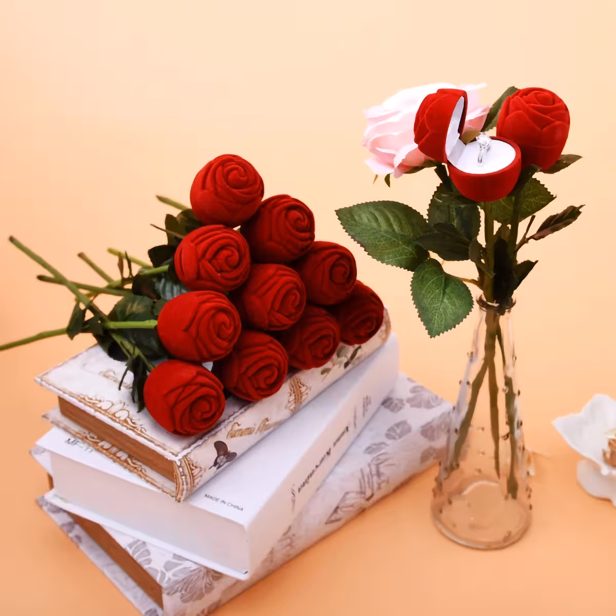 Fløjlsæske i form af rose til ring, øreringe eller vedhæng – romantisk præsentation