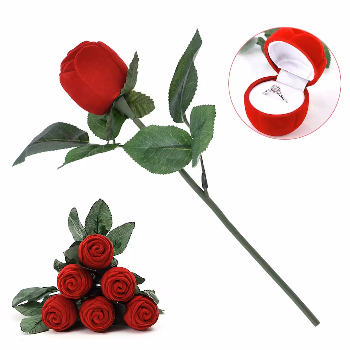 Er det længe ventede øjeblik ved at nærme sig? Giv smykket i en unik præsentationsæske, der udtrykker følelser og elegance. Denne rød rose-æske med grønne blade er det perfekte symbol på kærlighed og hengivenhed.