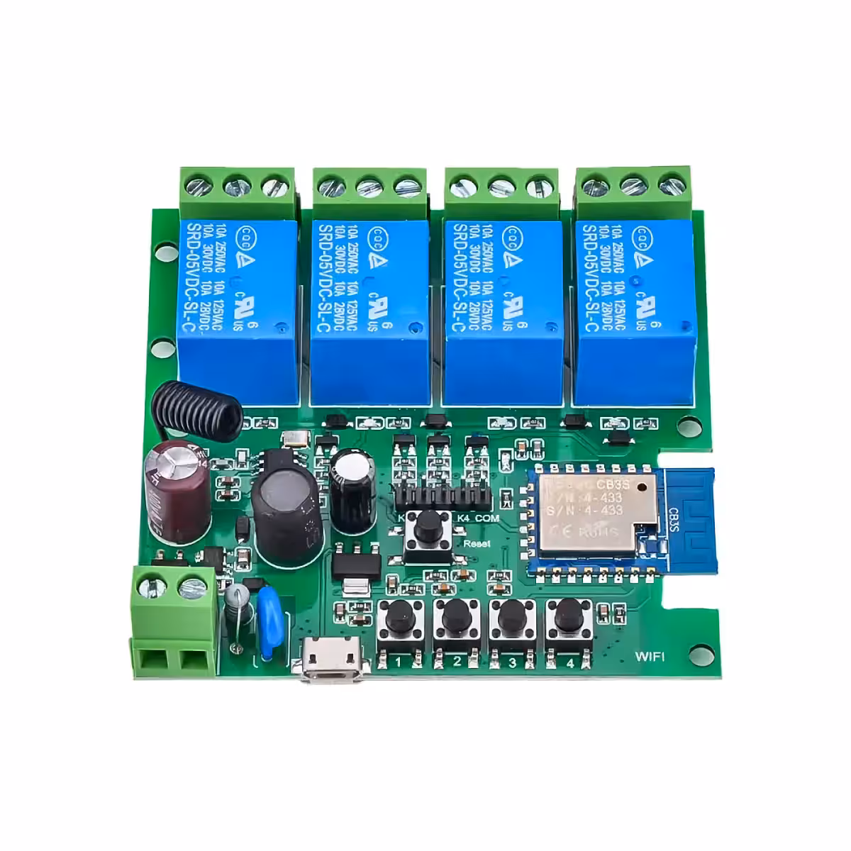 Dette smart WiFi-relæ med 4 kanaler giver trådløs kontrol af elektriske apparater, enten fjernbetjent via Tuya / Smart Life appen eller med stemmekontrol gennem Amazon Alexa eller Google Home. Ideel til automatisering af døre, belysning, varmesystemer eller elektriske motorer.